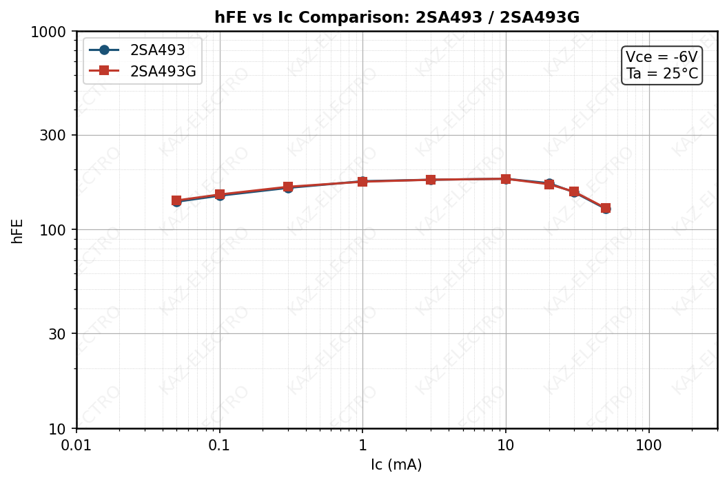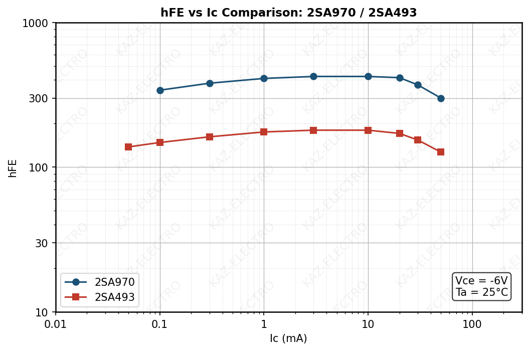 The 2SA493/2SC1000 is Toshiba’s first 50V low-noise complementary pair, released in the early 1970s.