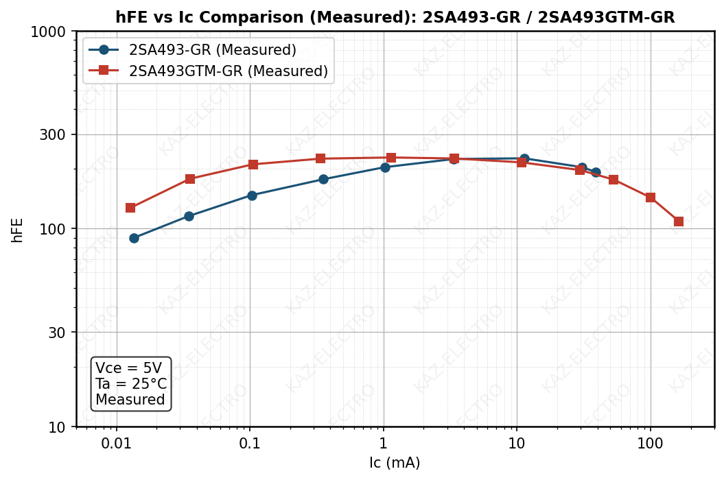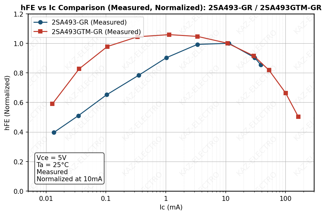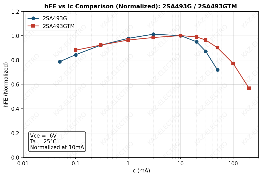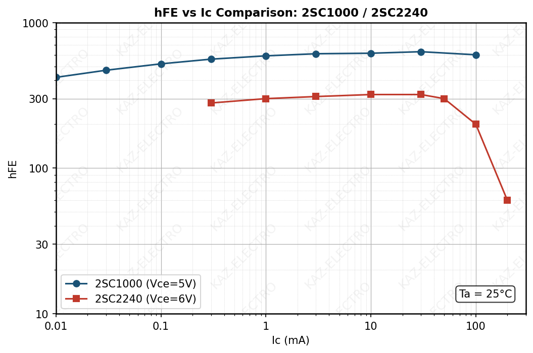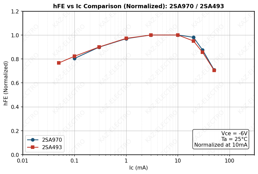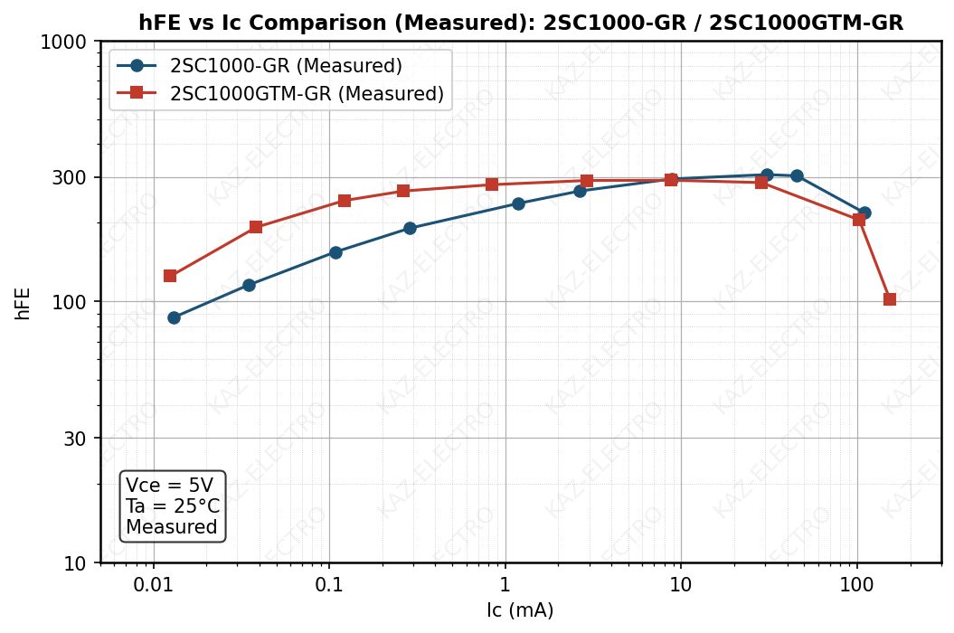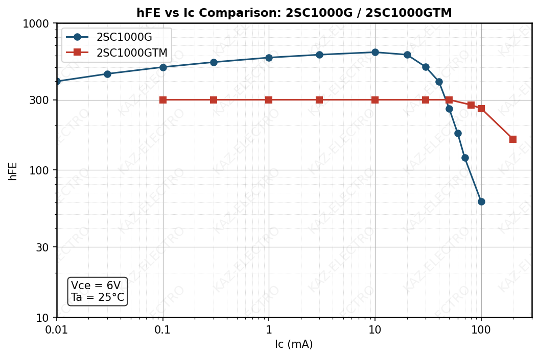 - hFE–IC curve comparison across family members
