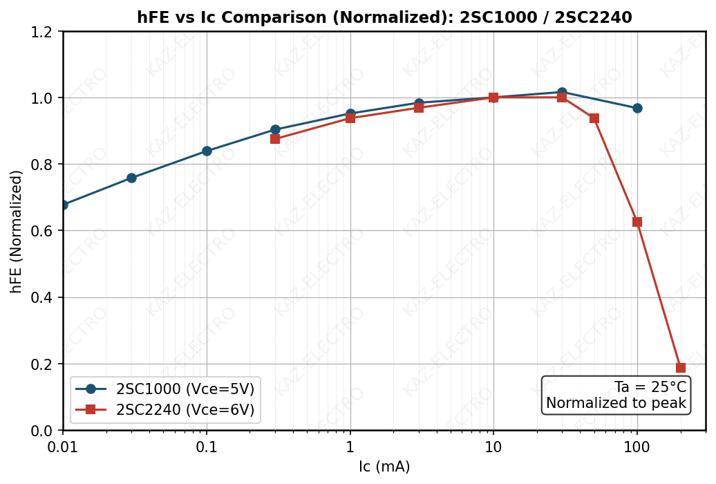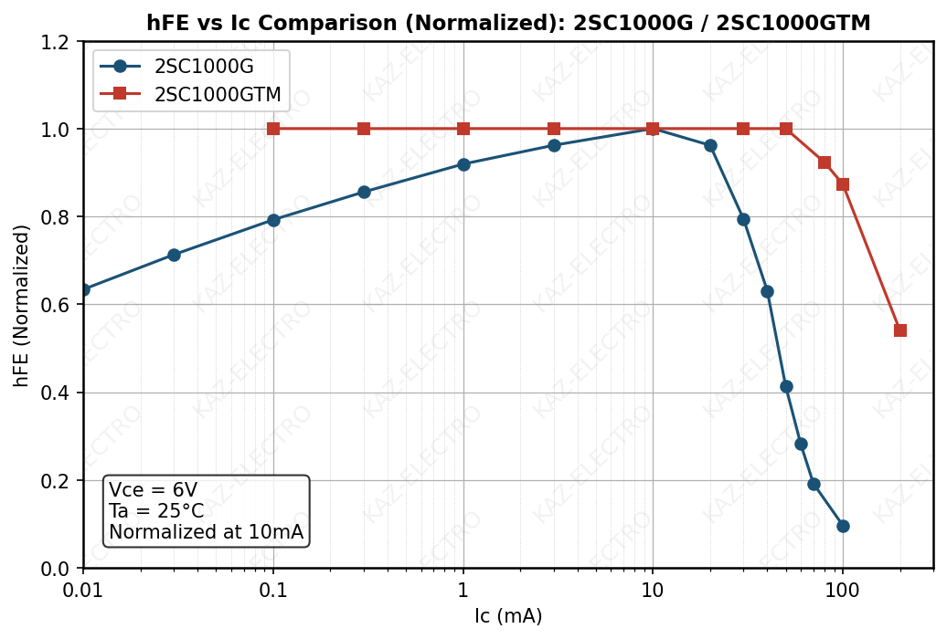 - The TO-98 era’s hFE–Ic characteristic — with its peak in the low-current range — may have contributed to the distinctive fuzz tone of those units.