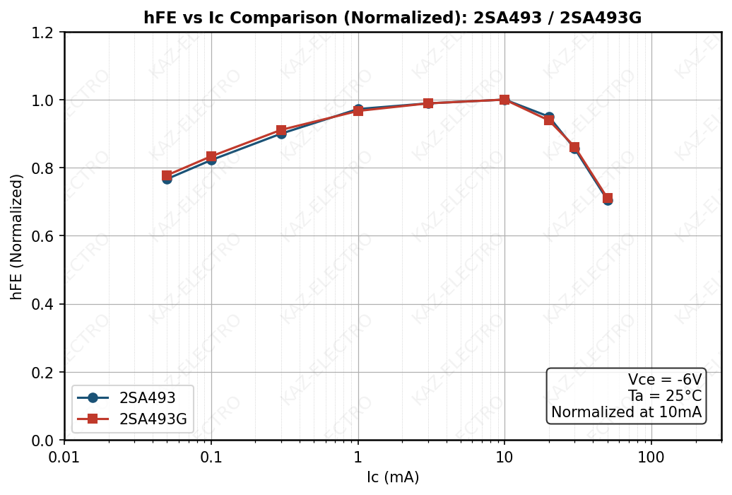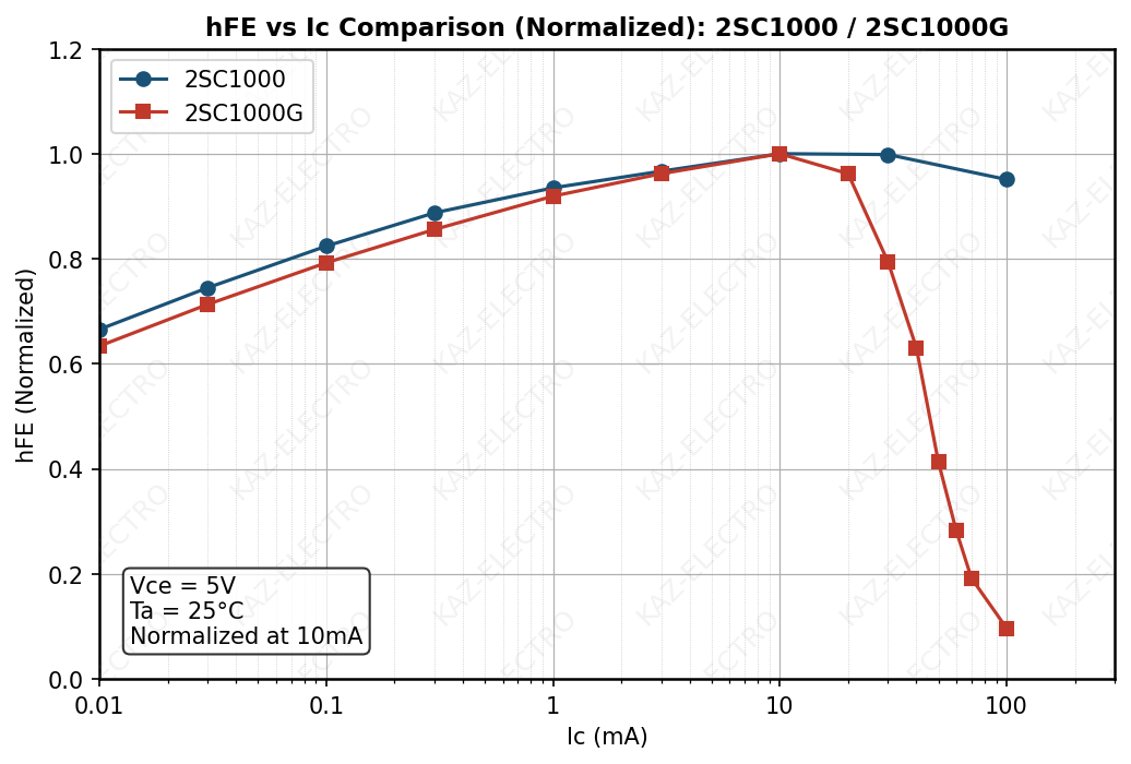 - The hFE–Ic characteristics of the original type and the G type are nearly identical — consistent with both being selected from the same die.